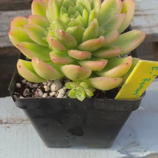 Originally imported from Korea but grown out here in the states. Echeveria lucidum, also known as Echeveria Roman, is a beautiful succulent known for its striking rosette shape and vibrant colors. It forms tight rosettes of fleshy, green leaves with pink or red tips. The leaves have a glossy, almost translucent appearance, giving the plant a unique and attractive look. The rosettes can grow up to 6 inches (15 cm) in diameter. Produces tall, slender stalks with small, pink or red bell-shaped flowers during the spring and summer months.