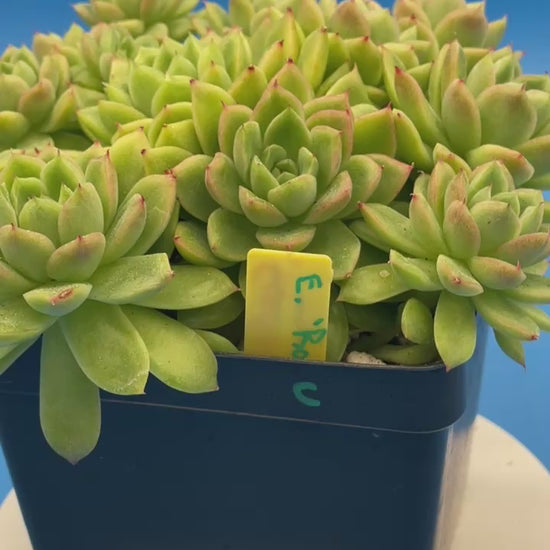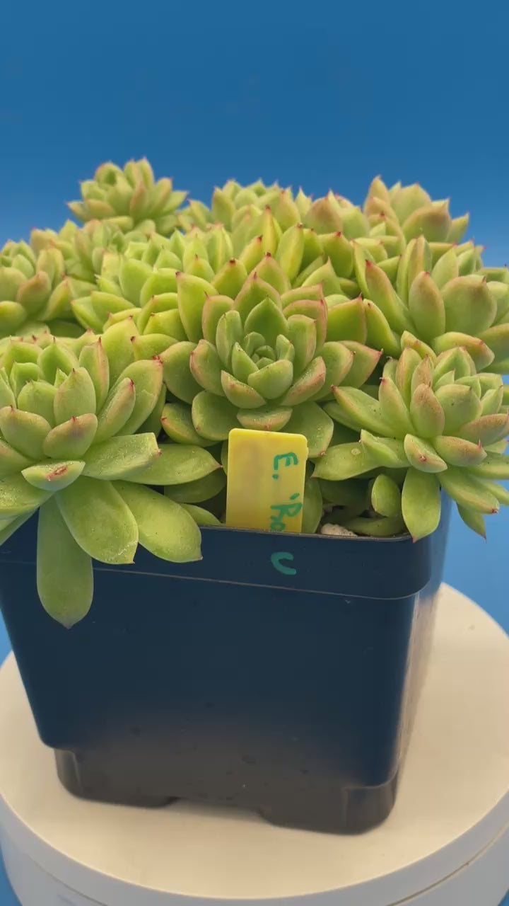 Originally imported from Korea but grown out here in the states. Echeveria lucidum, also known as Echeveria Roman, is a beautiful succulent known for its striking rosette shape and vibrant colors. It forms tight rosettes of fleshy, green leaves with pink or red tips. The leaves have a glossy, almost translucent appearance, giving the plant a unique and attractive look. The rosettes can grow up to 6 inches (15 cm) in diameter. Produces tall, slender stalks with small, pink or red bell-shaped flowers during the spring and summer months.