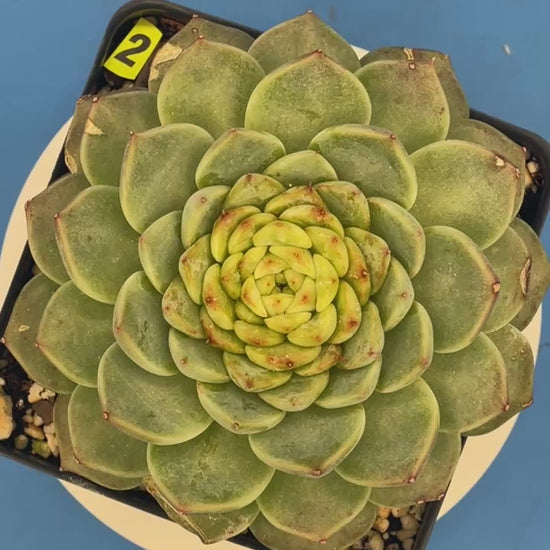 Echeveria 'Red Velvet' is a stunning hybrid succulent, known for its compact rosette shape and vibrant colors. It forms rosettes of broad, triangle-shaped leaves with pointed tips. The leaves are typically blue/green with a powdery coating of natural wax (farina) and will turn pink with a beautiful red "Sugar Heart" effect in bright sunlight or cooler weather (Stress colors as they are so aptly named). The rosettes can grow up to 6–8 inches (15–20 cm) in diameter.