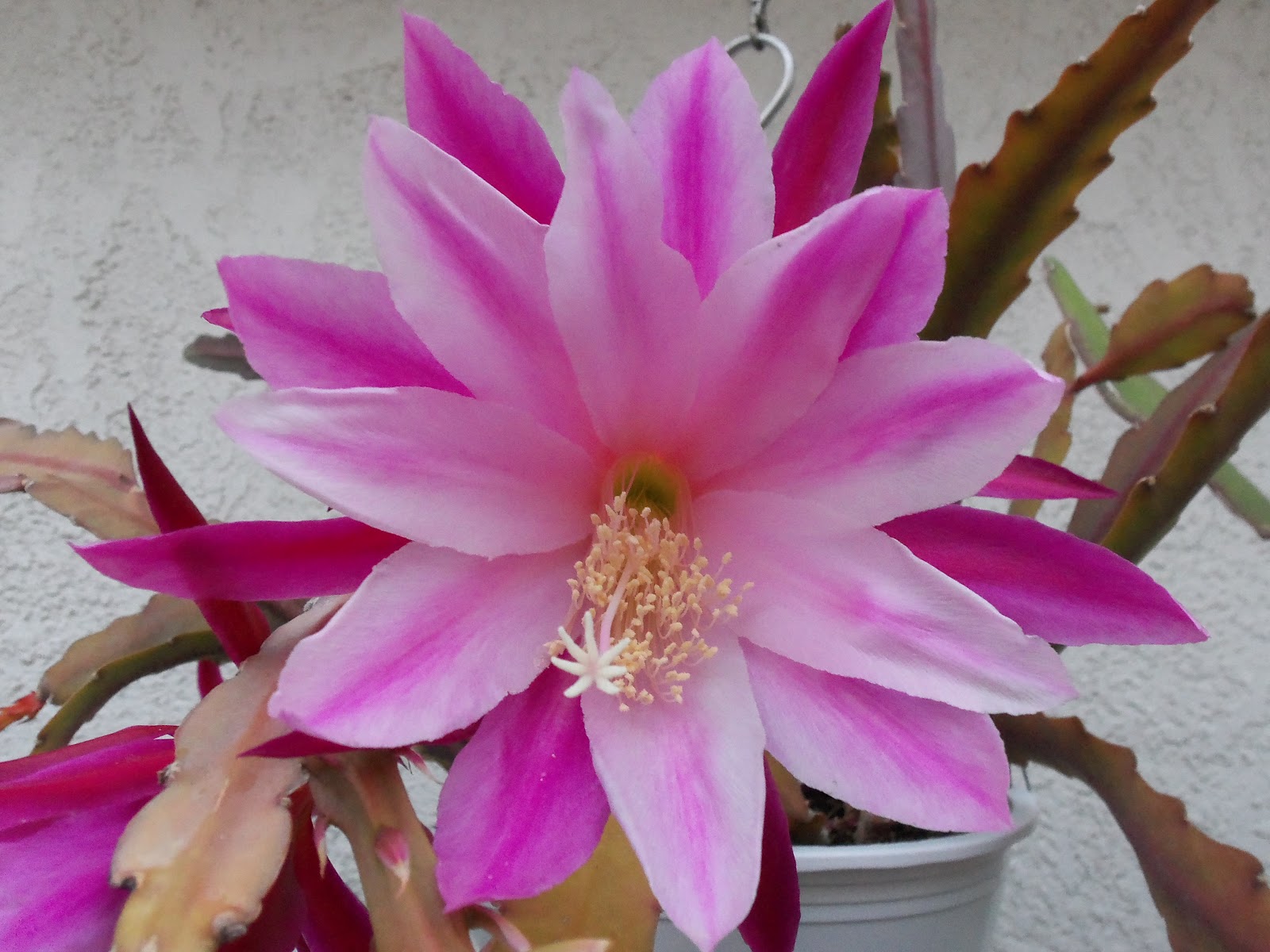 The parent species from which epiphyllum hybrids were bred are different in appearance and habit from most cacti. They are found in the tropical forests of Central America where they grow as climbers or on trees as epiphytes. They have leafless (or apparently leafless) flattened stems which act as the plant’s photosynthetic organs. Relatively large flowers are borne on the sides of the stems; in many species they open at night