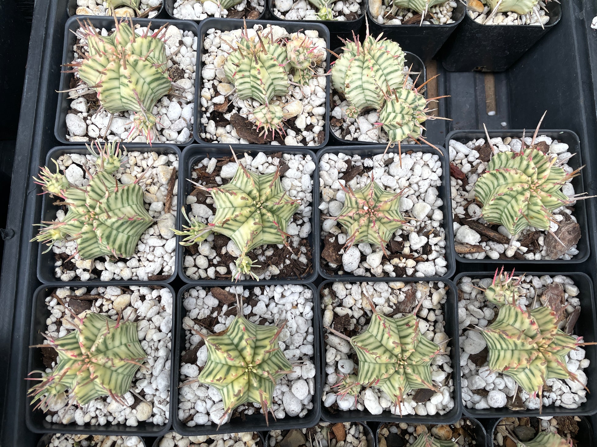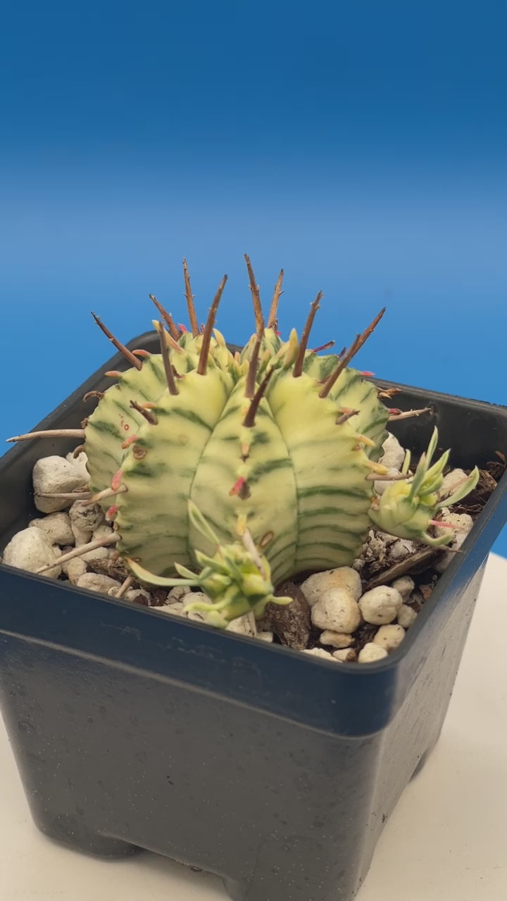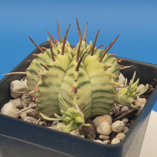This is a listing for a Variegated Euphorbia Meloformis. It is very healthy and very easy to grow. I have been growing them for 4 years and have yet to loose one! They are planted in 3" short pots and fully rooted. Most are starting to produce pups already! Euphorbia meloformis has a rounded, melon-like shape, which is why it's often referred to as "Melon Spurge."