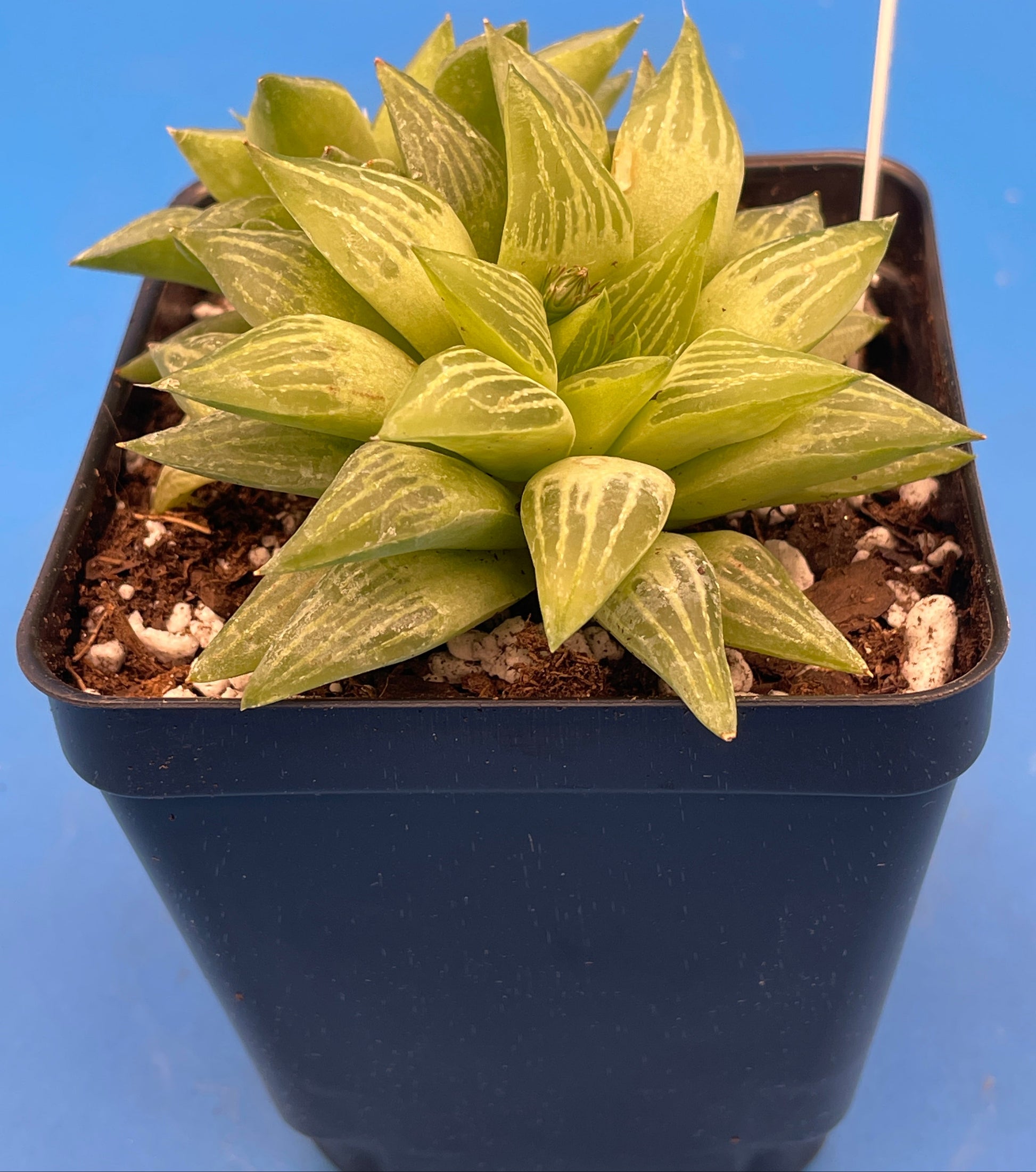 This funny succulent is quick to make clusters with its off shoots. Each of the succulent leaves are green and stretch upwards with the triangular leaf face that faces upwards being translucent. The transparent leaf tip stands out and is great to look at. The skinnier leaf gives space betwteen each leaf giving this variety a different look, since many haworthia leaves tend to be tight together. Not to mention it requires little maintenance and has basic needs, makes this a great house plant.