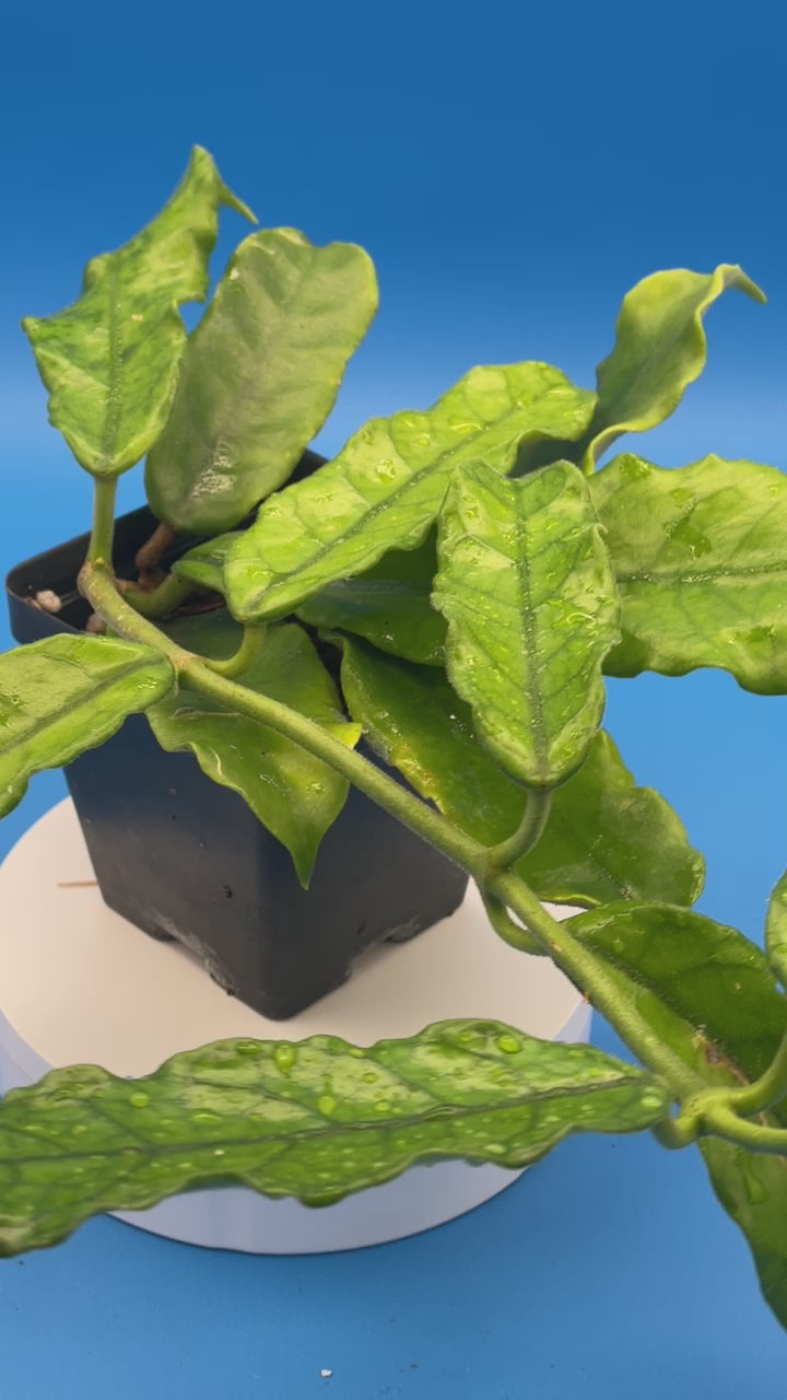 Broad and long green leaves with dark veining and covered in short fuzzy hairs litter the vining stems of this hoya. The darker veins can give the top of the leaf an alligator skin like pattern. This variety tends to be a little more sensitive to over watering than other hoyas and will let you know with yellowing leaves that will eventually fall of; less is more with this hoya. Popular as a house plant because of its low maintenance and the long trailing growth that is commonly in bloom with umbels of fuzzy star shaped flowers.